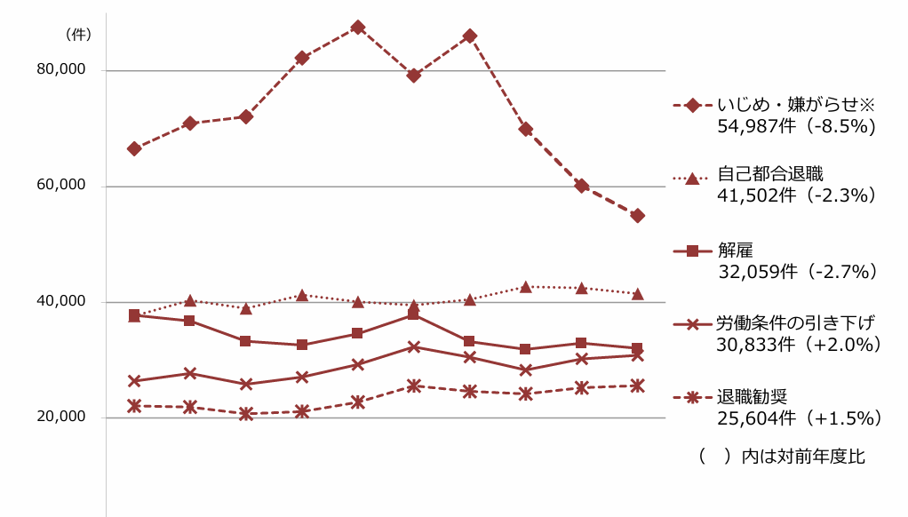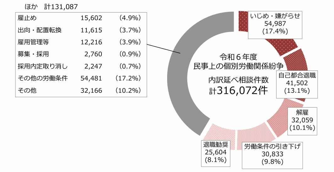 厚生労働省によると、職場のトラブルに関する相談件数が令和5年度の1年間で120万件を超えており、個別相談内容としては、①いじめ・いやがらせ②自己都合退職③解雇の割合が多くなっています。