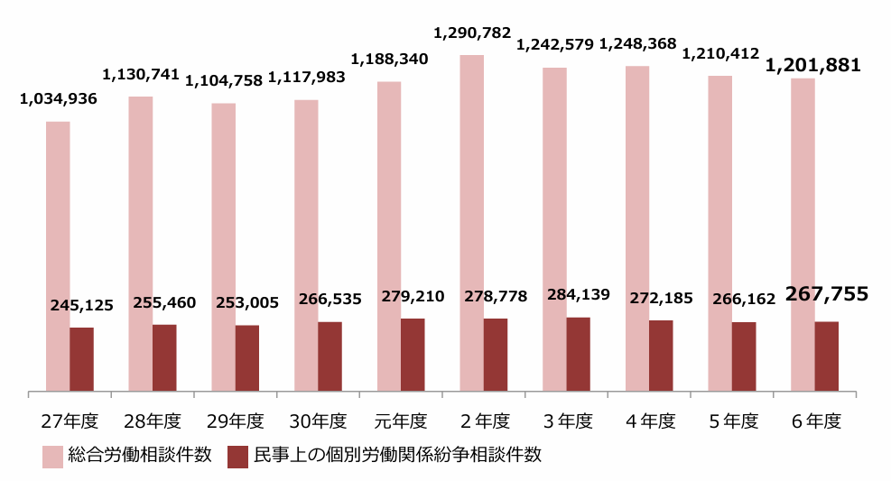厚生労働省によれば、令和6年度の総合労働相談件数は、120万1,881件(前年度比0.7%減)と、5年連続で120万件を超え高止まりしています。
