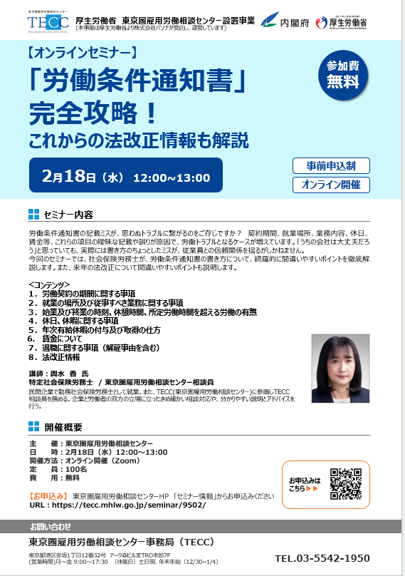 東京圏雇用労働相談センター(TECC)主催で、無料オンラインセミナー「労働条件通知書」完全攻略! ~これからの法改正情報も解説~」